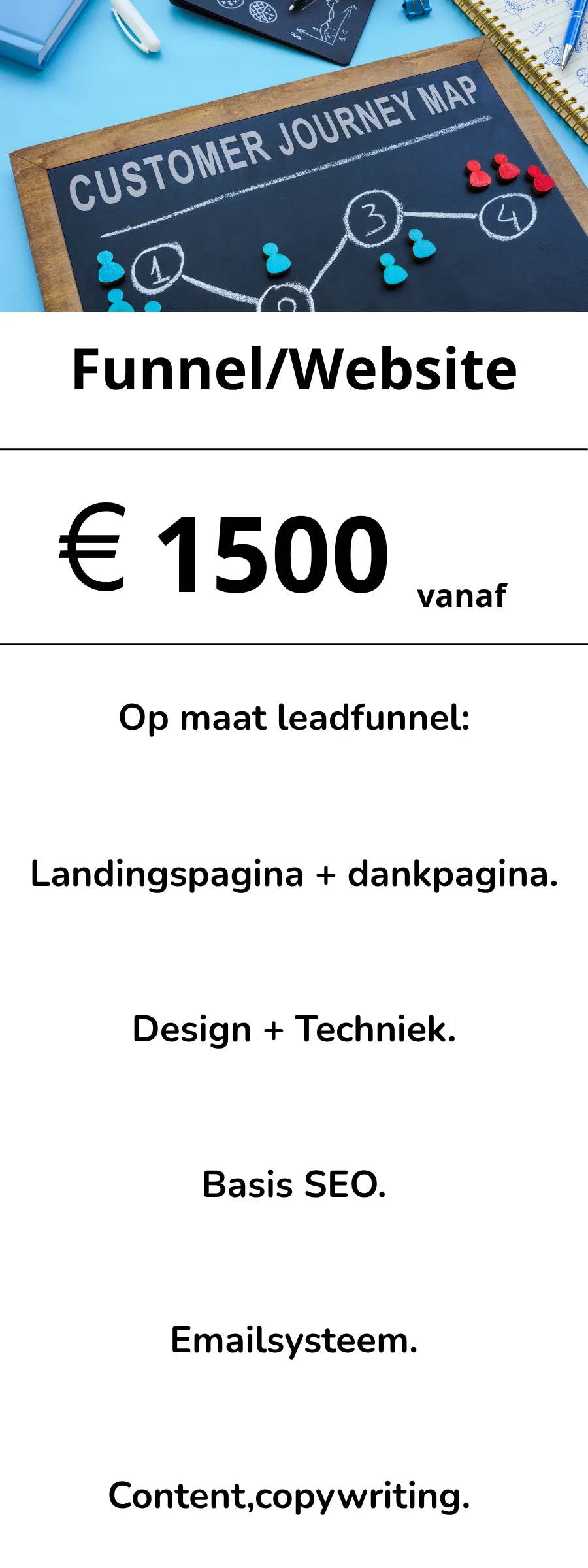 Een funnel is een slimme route die je klant stap voor stap volgt, van “hé wat is dit?” naar “ja, dit wil ik kopen!